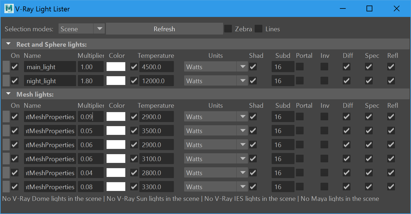Alle sechs Light Meshes erhalten einen warmweißen Farbton um 3000 Kelvin mit Intensitäten zwischen 0.04 und 0.09 Watt. Leichte Unterschiede in Intensität und Farbe erzeugen beim Rendering dann eine realistisch wirkende Unregelmäßigkeit. Um Rauschen zu minimieren, werden für alle Lichtquellen die Sampling-Raten auf 16 Subdivs pro Lichtquelle erhöht.