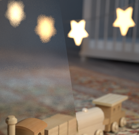Mit den ersten Render-Einstellungen zeigen sowohl die Schatten und Reflexionen als auch der Unschärfe-Effekt noch ein hohes Maß an Rauschen. Insbesondere an den Lichtquellen der sichtbaren Sterne in der Lichterkette ist dieses Rauschen immens zu sehen und störend.