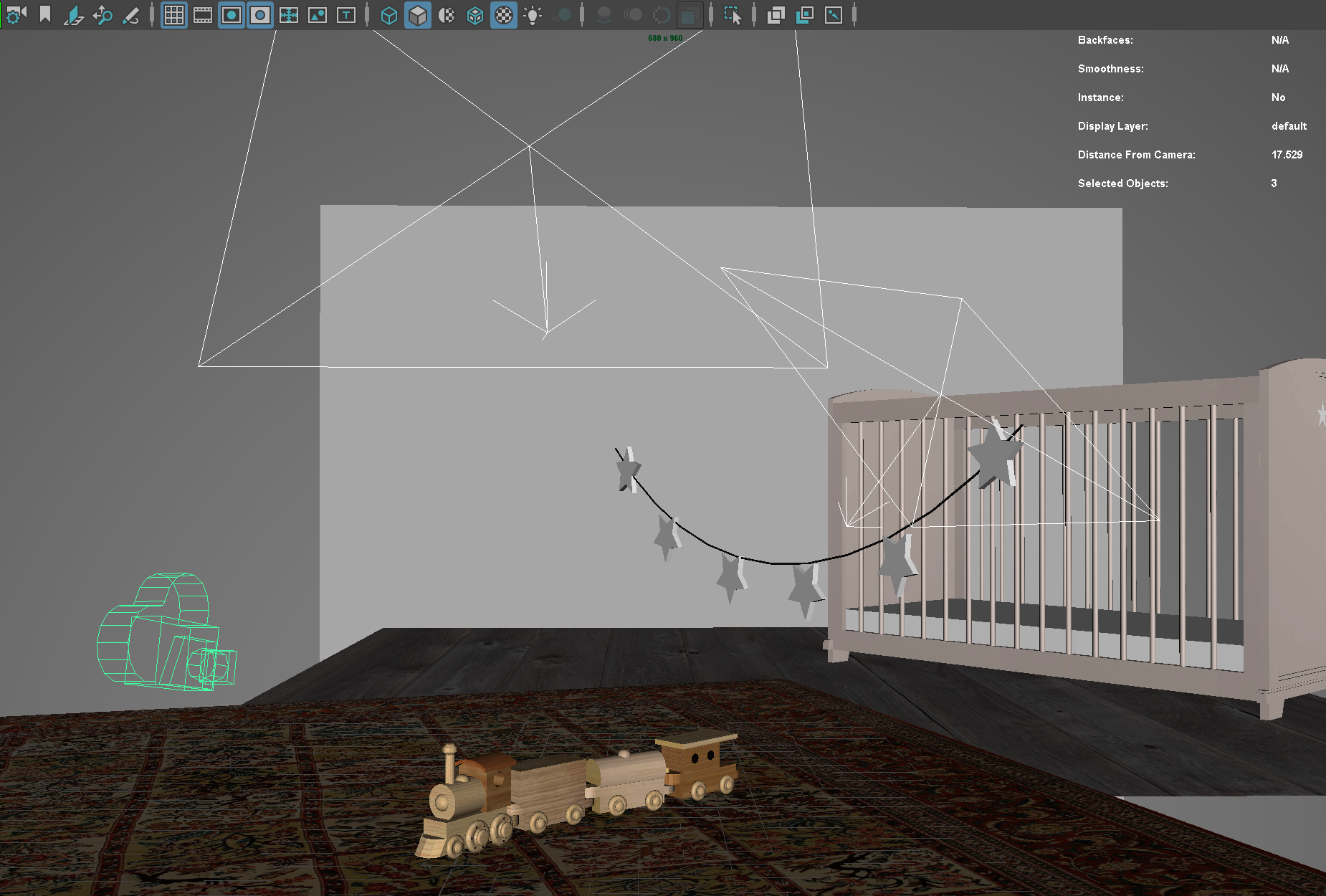 Der Aufbau der Szene ist denkbar einfach. Der Teppich als polygonale Fläche bildet die Basis der Szene. Leicht nach hinten verschoben und ein paar Millimeter tiefer liegt eine zweite Fläche, die den Holzboden-Shader aufnimmt. Die dahinter liegende Wand bekommt ein hellgraues VRayMtl. Um den Raum nicht vollständig modellieren zu müssen und dennoch genügend Fläche für reflektierende Lichtstrahlen zu haben, wird einfach eine Kugel um die Szene gelegt und die Normalvektoren nach innen gedreht. Zwischen Wand und Teppich kommt das Babybett und auf dem Teppich wird der Holzzug platziert.