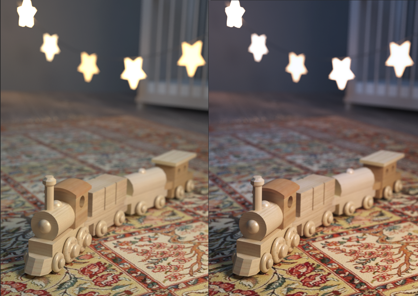 Zur Grundbeleuchtung verwenden wir zwei VRayLightRects. Das erste mit einer Intensität von 1.8 Watt und einer blauen Lichtfarbe wird oberhalb der Szene positioniert und in Richtung der Wand orientiert. Damit soll ein Licht ähnlich einem Mondlicht, das durch ein Fenster fällt, simuliert werden. Das zweite Licht wird rechts oberhalb des Zuges positioniert und mit einem weißen Licht von 4500 Kelvin bei 1.0 Watt Intensität auf das Spielzeug gerichtet. Die Lichterkette zwischen Zug und Bettchen besteht aus sechs Sternen, die jeweils angewählt und mit dem Befehl Create | V-Ray > Mesh Lights > Turn selection into lights zu einer eigenen Lichtquelle umgewandelt werden.