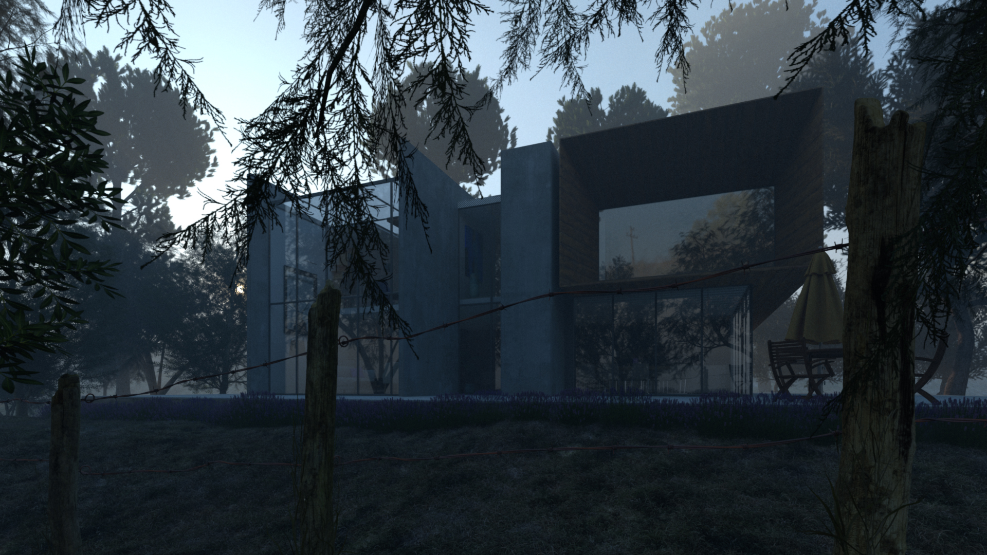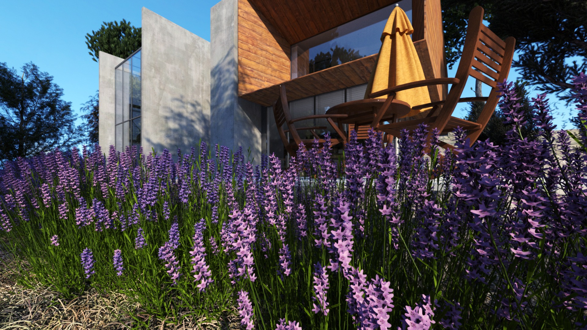 All vegetation assets used in the scene are taken from the Xfrog complete plants bundle. Three of the eight lavender bushes (AG11_Lavandula_angustifolia) are scattered 35 times in front of the concrete base of the residence.