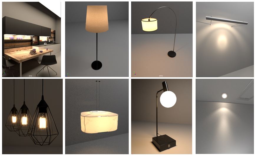 Eight different lamp models have been used to create the interior lighting. Three of them use the VRayMtl2Sided to create a translucent surface consisting of fabric.