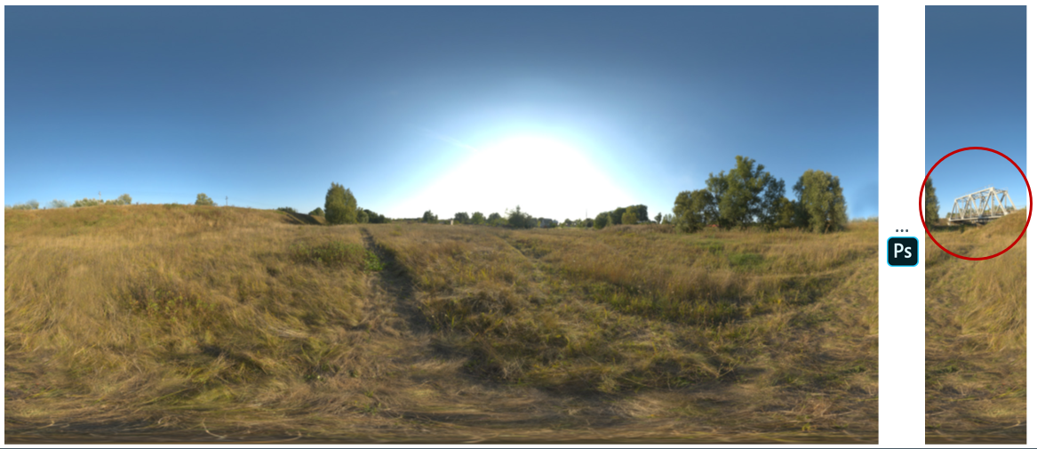 Two different HDRIs are used for Image Based Lighting (IBL) of the scene. The sunny afternoon is lit by an HDRI called Railway Bridge 02 from www.hdrihaven.com. The time of the day and the yellow color of the dry grass perfectly matches the designated late afternoon mood. Obviously, the railway bridge does not figure the scene and had to be removed in Photoshop.